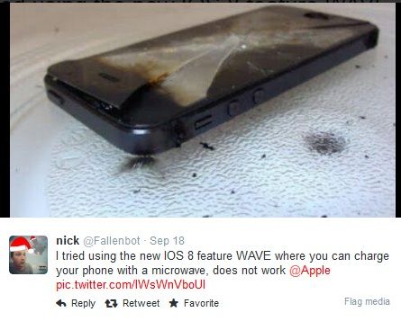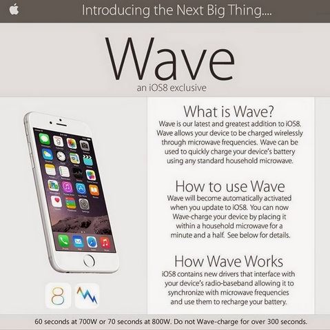 Una nueva característica del iPhone 6 cuando se actualiza a iOS 8 es "Wave". Básicamente es una funcion que permite la carga rápida de la batería del iPhone si lo metes en un horno microondas por 60 segundos.